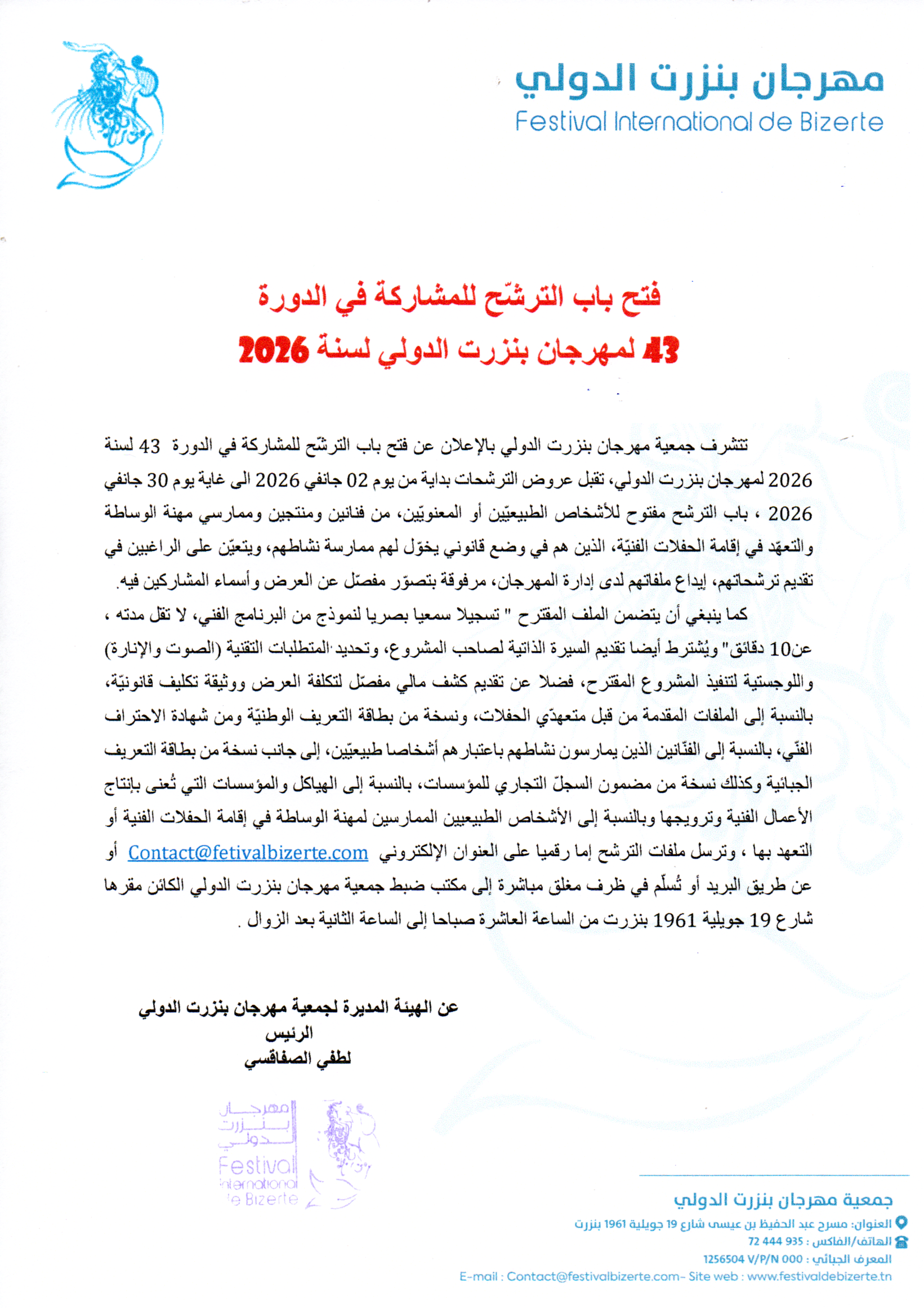 فتح باب الترشح للمشاركة في الدورة 43 لمهرجان بنزرت الدولي لسنة 2026